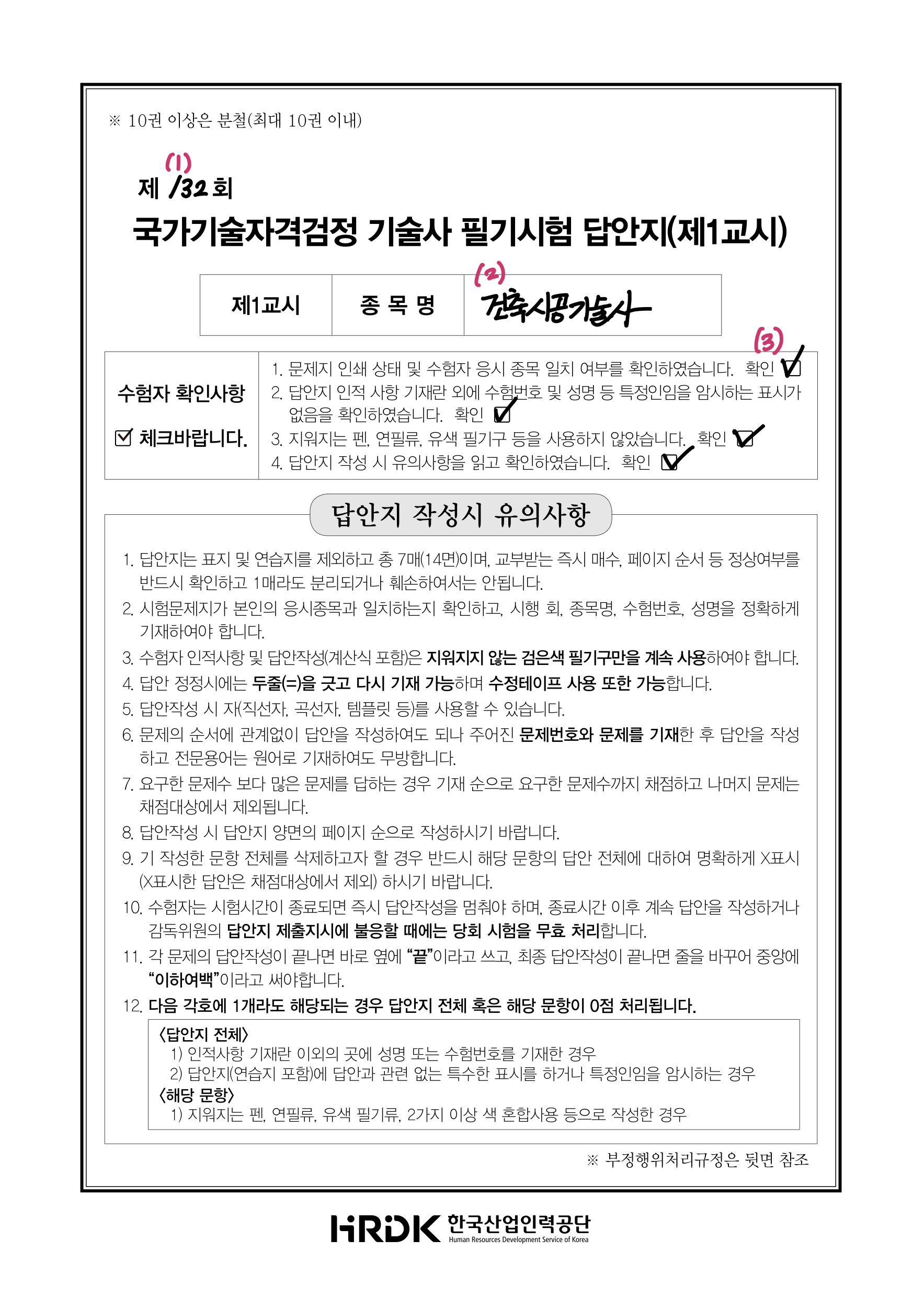 ! 주의사항: 표지에 성명 또는 수험번호를 작성하시면 절대 안 됩니다. 절대 정해진 위치에만 인적사항을 작성해야 합니다. 그렇지 않아 0점 처리된 수험생이 있었습니다.