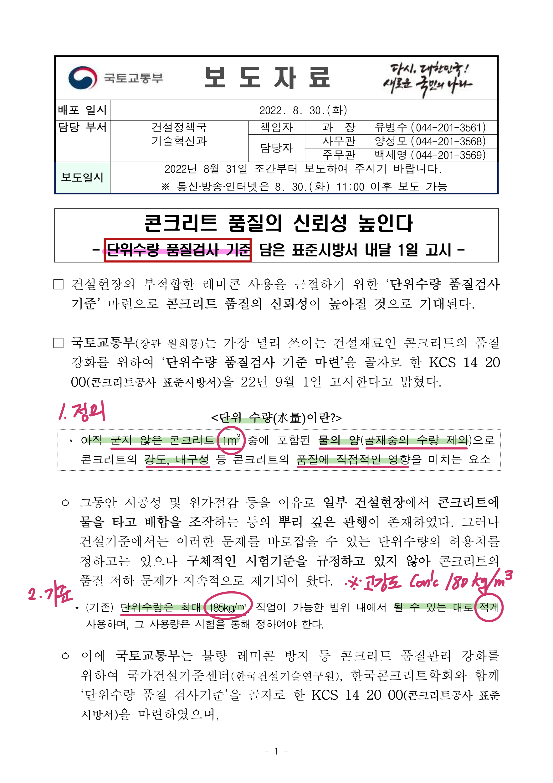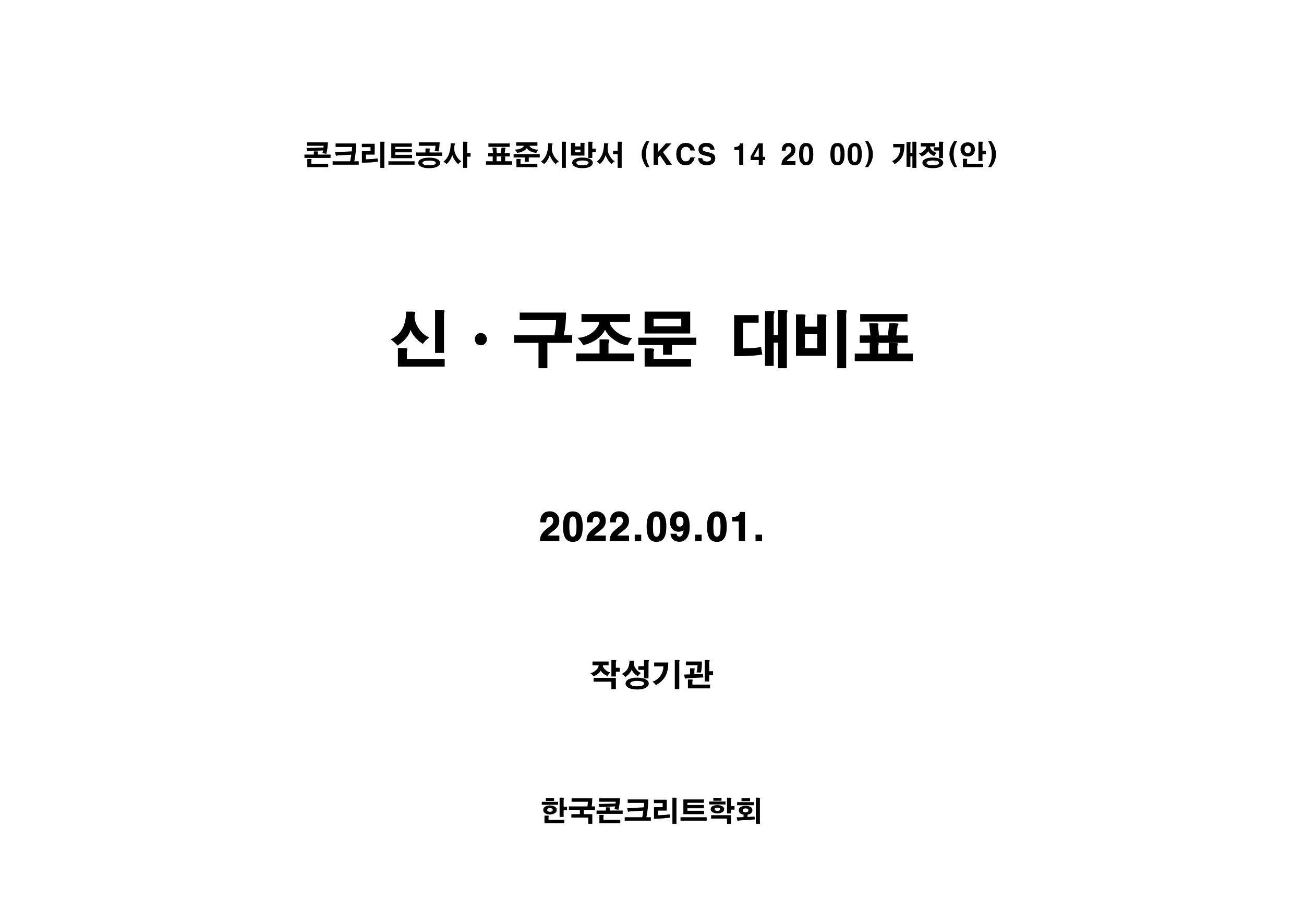 '22년 9월 1일, "KCS 14 20 00 콘크리트 공사 표준시방서"가 개정되었습니다. (국토교통부 고시 제202-499호)