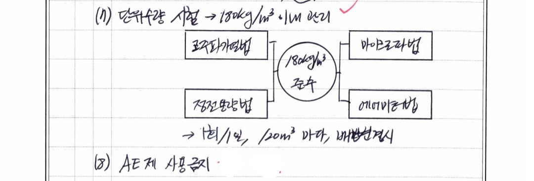 - 최대 185 kg/m3, 작업이 가능한 범위 내에서 가능한 적게, 시방배합 ±20 kg/m3 이내