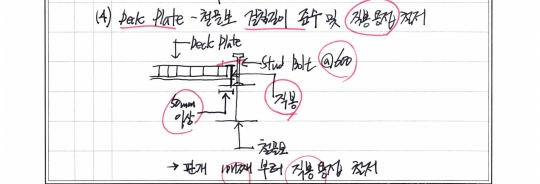 - 데크플레이트 걸침 길이, 접합/이음방법 및 설치 간격 시공상세도 명시