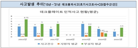 최근 7년간 연 3건 발생하고 있으며, 특히 구조물 붕괴 등으로 연 1.6명의 사망자가 발생하고 있습니다.