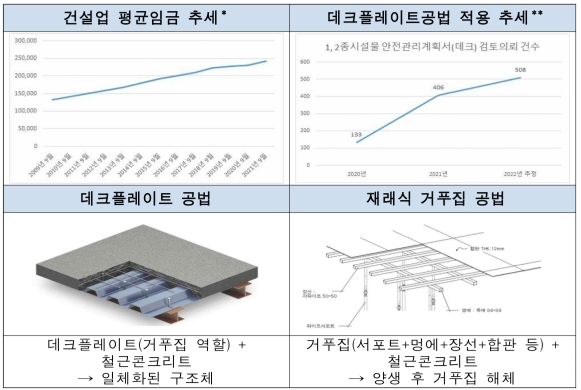 많은 현장에서 인건비 상승, 높은 층고 대응용 가설비 절감, 폐기물 저감 등의 사유로 데크플레이트 공법을 선택하기 때문입니다.