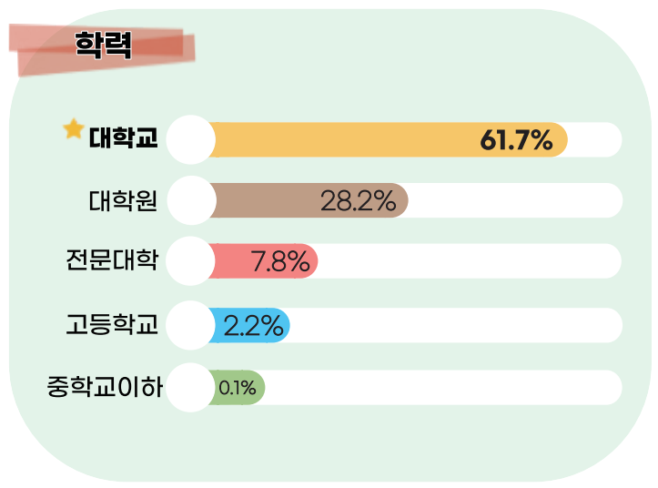 본 통계는 2022년에 국가기술자격 필기시험 원서접수 시 수험자가 직접 응답한 설문 결과를 바탕으로 작성되었으니 100% 정확하지는 않겠지만 대략적인 Trend를 파악할 수 있을 것 같습니다.