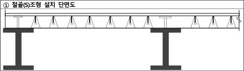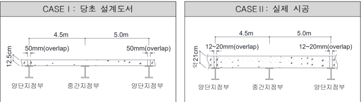 - 당초 설계 도서: 양단 지점부 걸침 길이 50mm + 스터드 용접 실시 → 무근콘크리트 t=125mm 타설