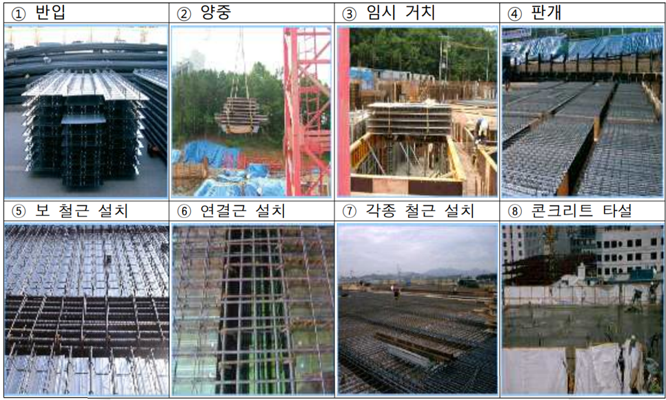 - 반입 → 양중 → 임시 거치 → 판개 → 보 철근 설치 → 연결근 설치 → 현장 배근 실시 → 콘크리트 타설