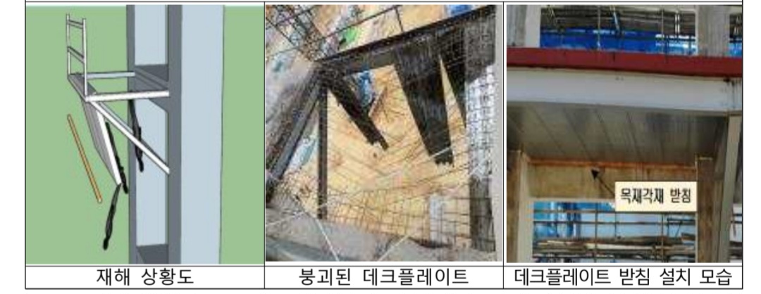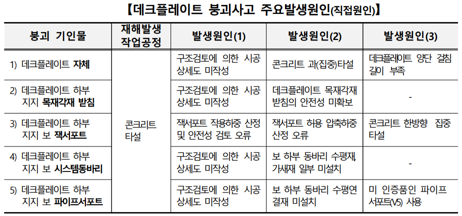 - 직접 원인: 데크플레이트 받침용 목재각재의 구체적인 설치 방법을 정하지 않고 작업자 임의로 콘크리트 못(간격 25cm 내외) 고정