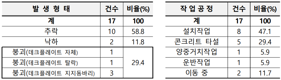 - 발생형태: 추락 59% > 붕괴 29% > 낙하 12%