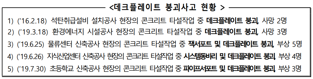 데크플레이트의 적용은 지속적으로 증가하는 가운데 데크플레이트 붕괴 사고 또한 줄어들지 않고 지속적으로 발생하고 있습니다.