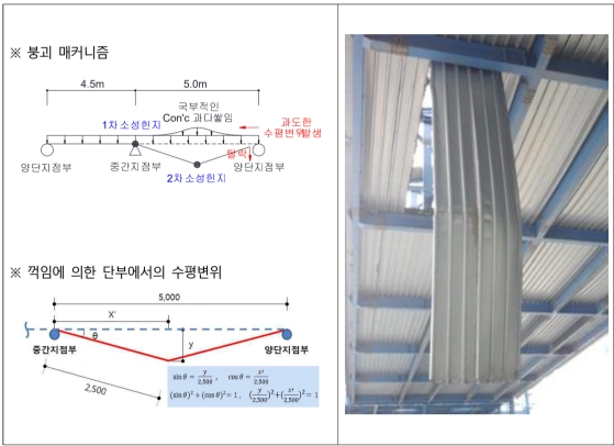(1) 구조물 시공 오차 등으로 걸침 길이 부족 → 콘크리트 타설 시 데크플레이트 처짐으로 양단부 지지점 탈락으로 붕괴