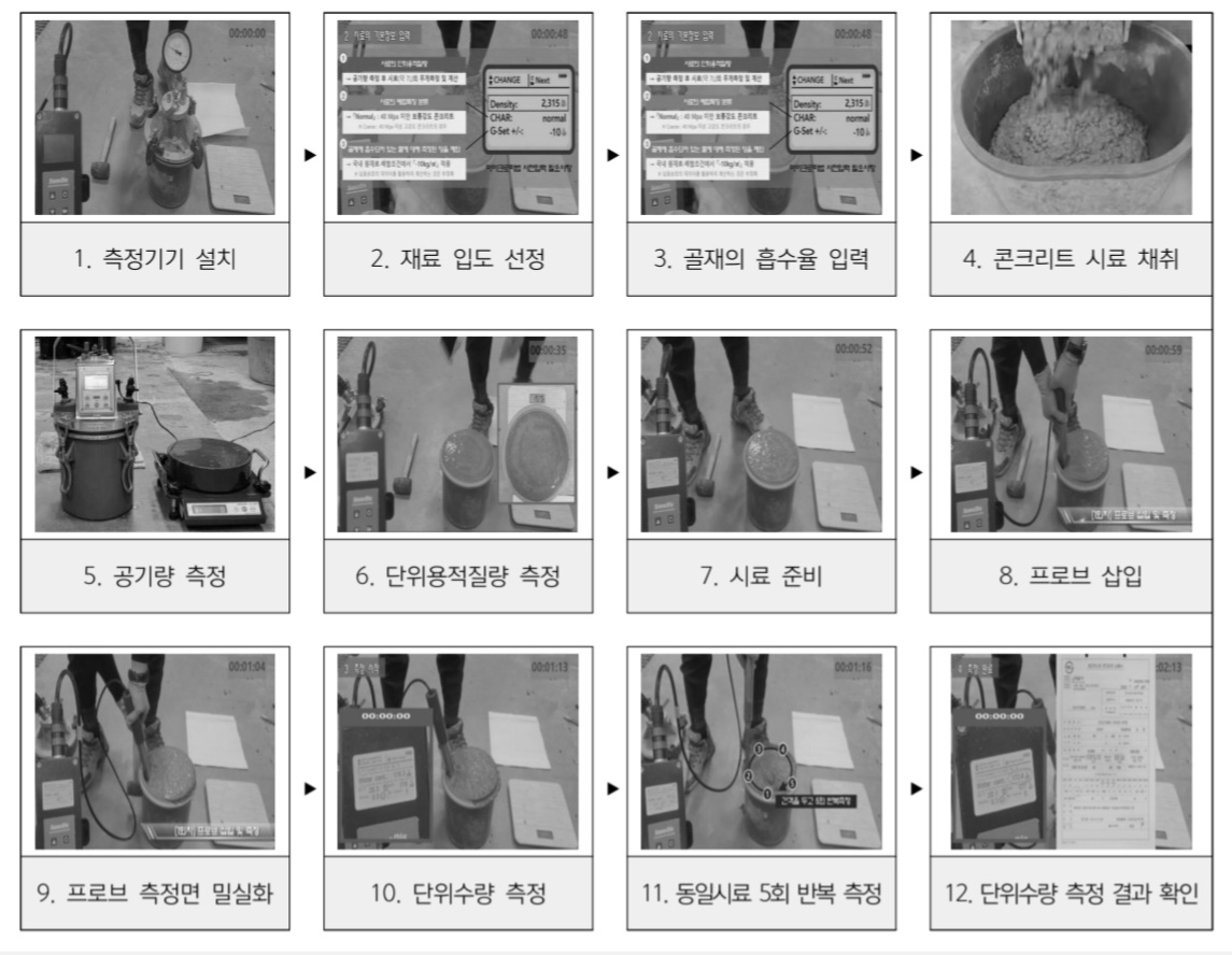 - 레미콘 타설 현장에서 굳지 않은 콘크리트의 단위수량을 신속하게 측정할 수 있는 시험방법 규정
