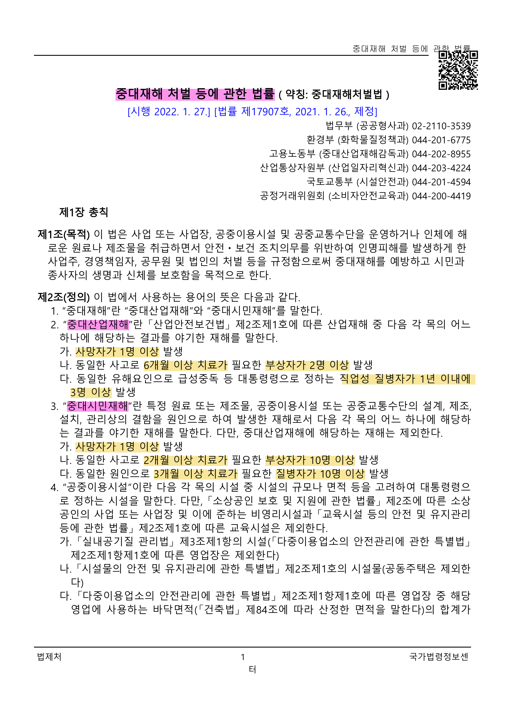 <중대재해 처벌 등에 관한 법률, 약칭: 중대재해처벌법>